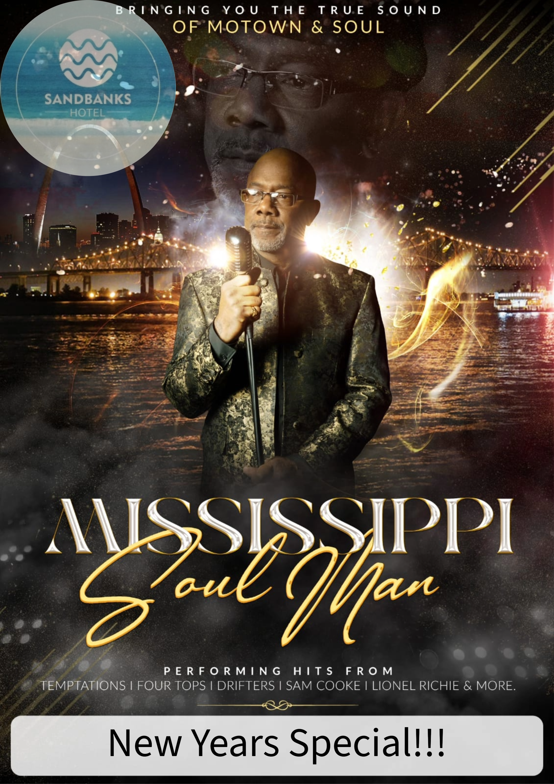 Introducing the Mississipi Soulman, bringing you the very best of Motown Soul. Mississipi Soulman is live for new year and we can't wait for you to see him, he is a crowd favourite here at the Sandbanks Hotel, so get you new years booked with us!!!